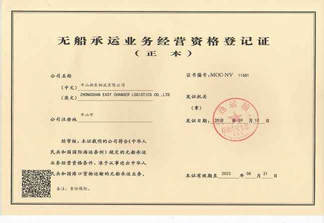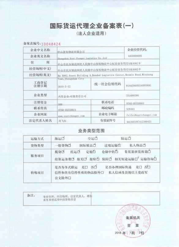 Certified enterprise certificate of AEO Certificate (East Changer logistics)